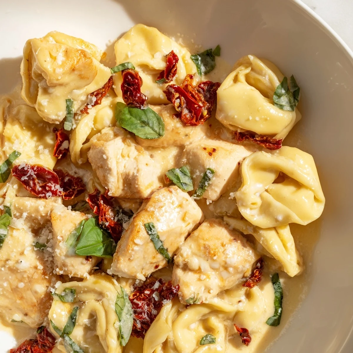 - Return that beautifully browned chicken to the pan and add your tortellini. Gently toss everything together until each piece is coated in that creamy sauce. Cover and let it simmer for 5-7 minutes, giving it an occasional stir. The tortellini will become tender while absorbing some of that sauce flavor.