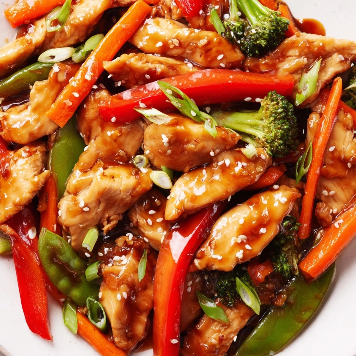 This vibrant dish features thinly sliced chicken breast stir-fried with colorful vegetables like red bell pepper, broccoli, and snap peas. The homemade sauce combines soy sauce, toasted sesame oil, honey, and rice vinegar for a perfect balance of salty, sweet, and tangy flavors. A touch of cornstarch creates a glossy coating that clings beautifully to every bite.